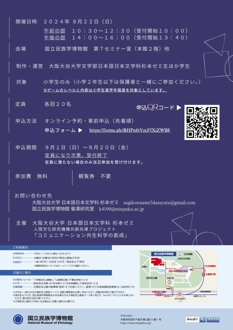 複言語・複文化脱出ゲーム 韓国編「韓国音楽フェスティバルからの脱出」 2024.09.22 2024-09-20 研究活動Activities 脱出ゲームで韓国の言葉と文化を楽しく学んでみませんか? 複言語・複文化脱出ゲーム 韓国編「韓国音楽フェスティバルからの脱出 開 催 日 2024年9月22日(日)時 間 午前の部 10:30~12:30(10:00~受付開始)午後の部 14:00~16:00(13:40~受付開始) 会 場 国立民族学博物館 第7セミナー室(本館2階) 他 監 修 諸昭喜(国立民族学博物館准教授)神野知恵(岩手大学准教授)菊永ふみ(異言語Lab) 制作運営 大阪大谷大学文学部日本語日本文学科杉本ゼミ生ほか学生対 象 小学生のみ(小学2年⽣以下は保護者と一緒にご参加ください。)※ゲームのレベルと内容は小学生高学年程度を対象としています。 参 加 費 無料(本館展示観覧券不要)定 員 各回20名 主 催 大阪大谷大学日本語日本文学科杉本ゼミ 人間文化研究機構共創先導プロジェクト「コミュニケーション共生科学の創成」