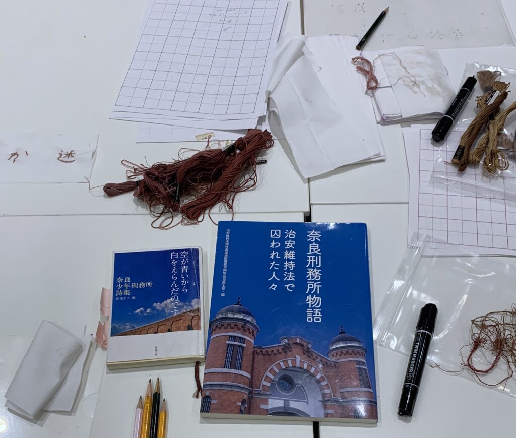 1日目は講演ののち、刺繍ワークショップ「声を縫う」を実施しました。ワークショップでは、刺繍という手仕事を通じて、旧奈良少年刑務所で受刑者の少年たちによって生まれた詩を媒介したコミュニケーションを、身体と時間に根ざした体験として共有しました。
