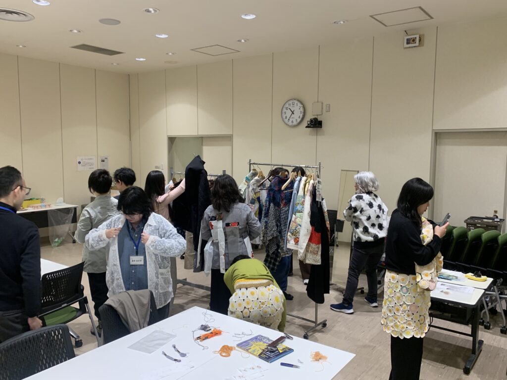 衣服ごとに異なる刺繍や造形的な工夫が施されており、視覚に障害のある参加者も、触覚を通してそれぞれの特徴を感じ取ることができました。参加者は複数の衣服を実際に身にまといながら、その違いや着心地を確かめていました。
