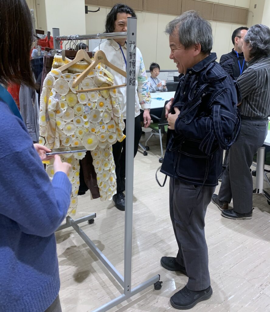 2日目は、1日目に引き続いて刺繍ワークショップに加え、試着体験を行いました。試着体験で用いられた衣服は、西尾先生が西成区山王にある創造活動拠点kioku手芸館『たんす』」に集う地域の高齢女性たちと共同制作したものです。