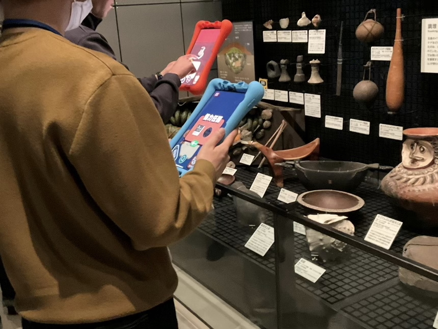 現地での研究会恒例となった多摩美術大学のシステム体験では、オセアニア展示場に出向き、タブレットを使って展示品や歴史について学ぶ探求ゲームや、視覚障害者と晴眼者が聴覚や触覚を通じて一緒に遊ぶことのできるゲームに加え、アイトラッカーを使用した展示鑑賞ガイドの体験を行いました。